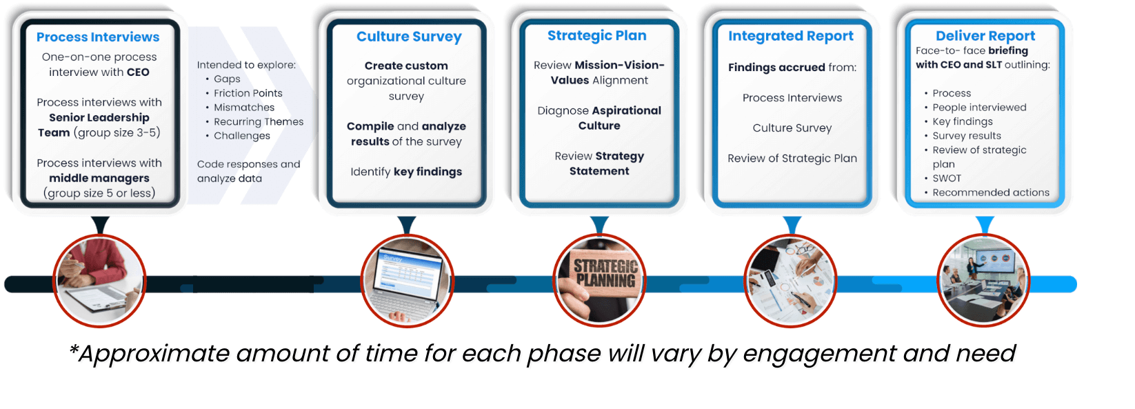 Below is an example of what a full culture Assessment and Transformation process could look like for your organization: